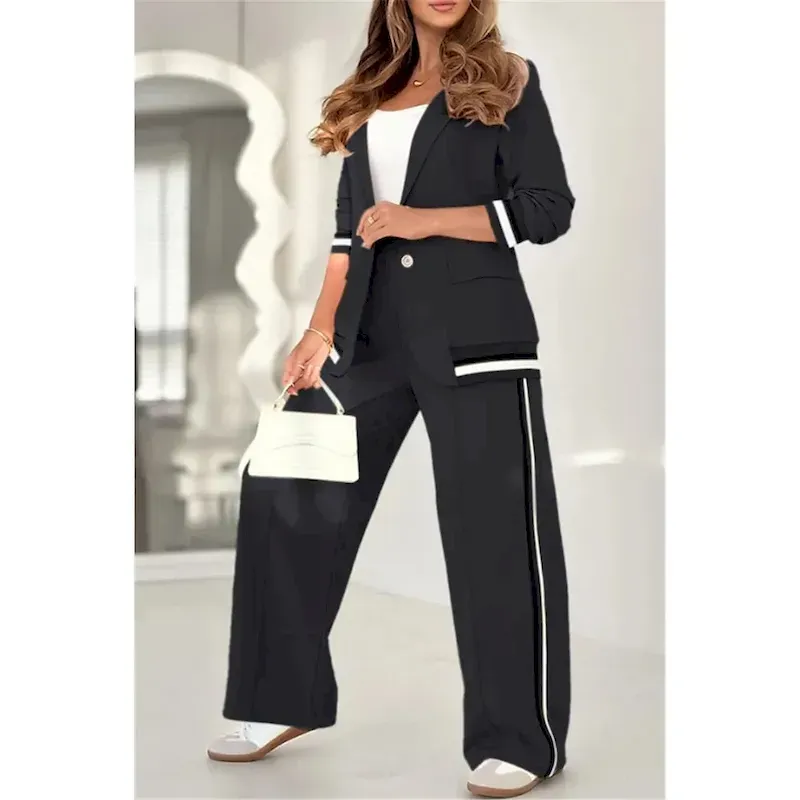 Womens-2-Pieces-Elegant-Fashion-Streetwear-Pants-Sets-Blazer-Suits-Long-Sleeve-Shirt-Collar-Striped-Outdoor-Work-Black-White-Brown-Summer-Regular-Fit
