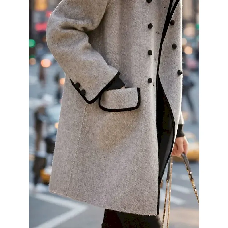 [Design Highlights]: Features a sophisticated double-breasted front with a classic turndown neckline and contrasting black buttons, this coat incorporates plain stripes and a plaid pattern. Side pockets add functionality, while the design retains an elegant touch for a timeless look.