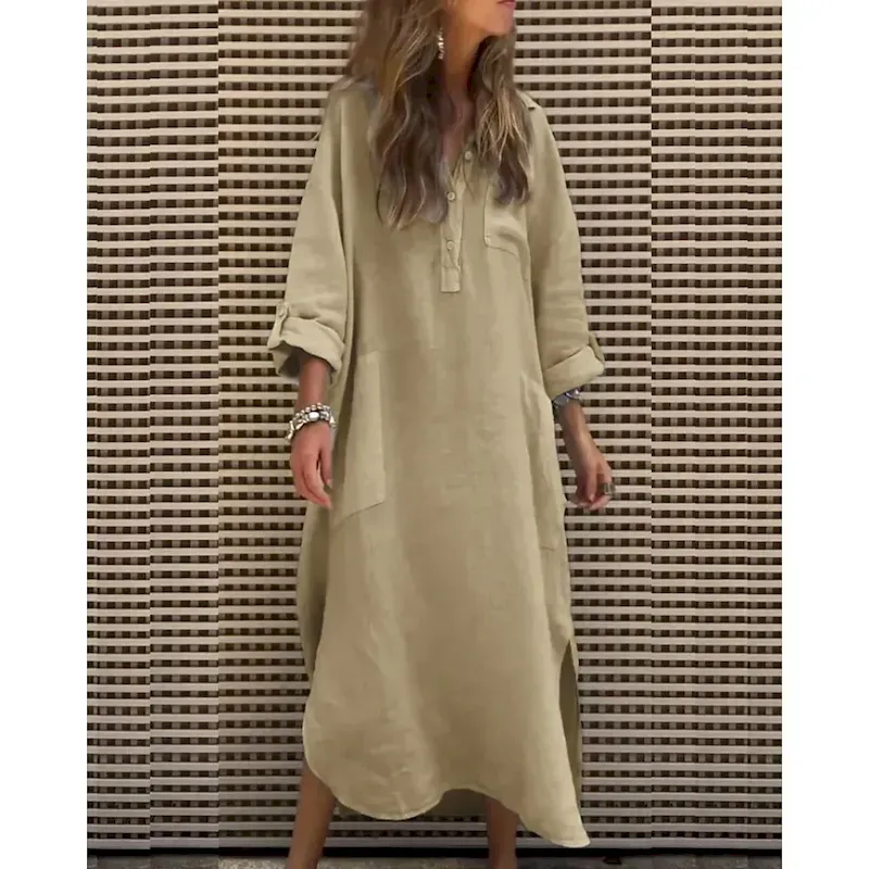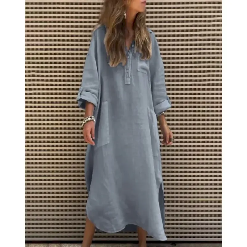 – Perfect for summer vacations- Made with lightweight polyester fabric- Classic style with a V-neckline- Features long sleeves for added elegance- Shirt dress design with buttons and pockets- Midi length for a versatile look- Ideal for women looking for a timeless and stylish outfit