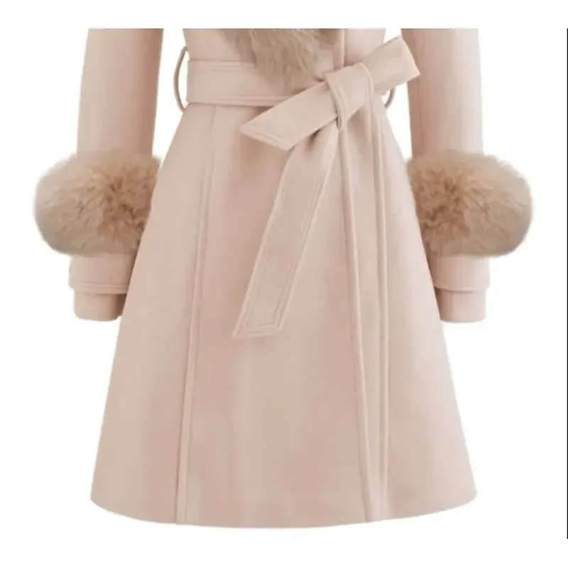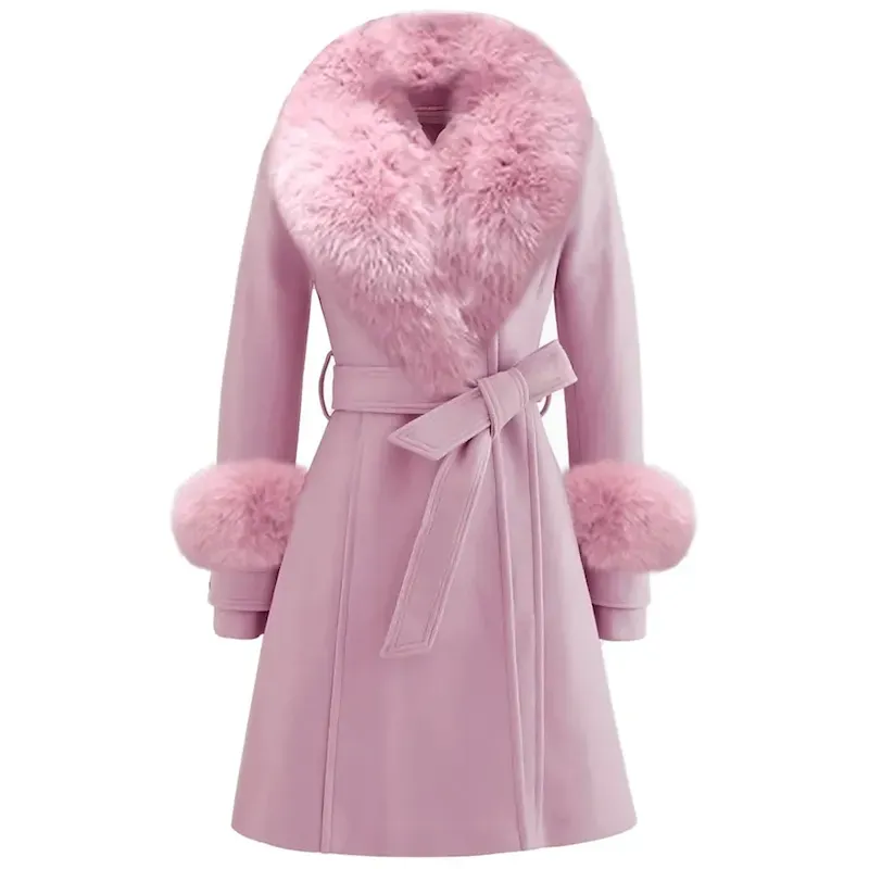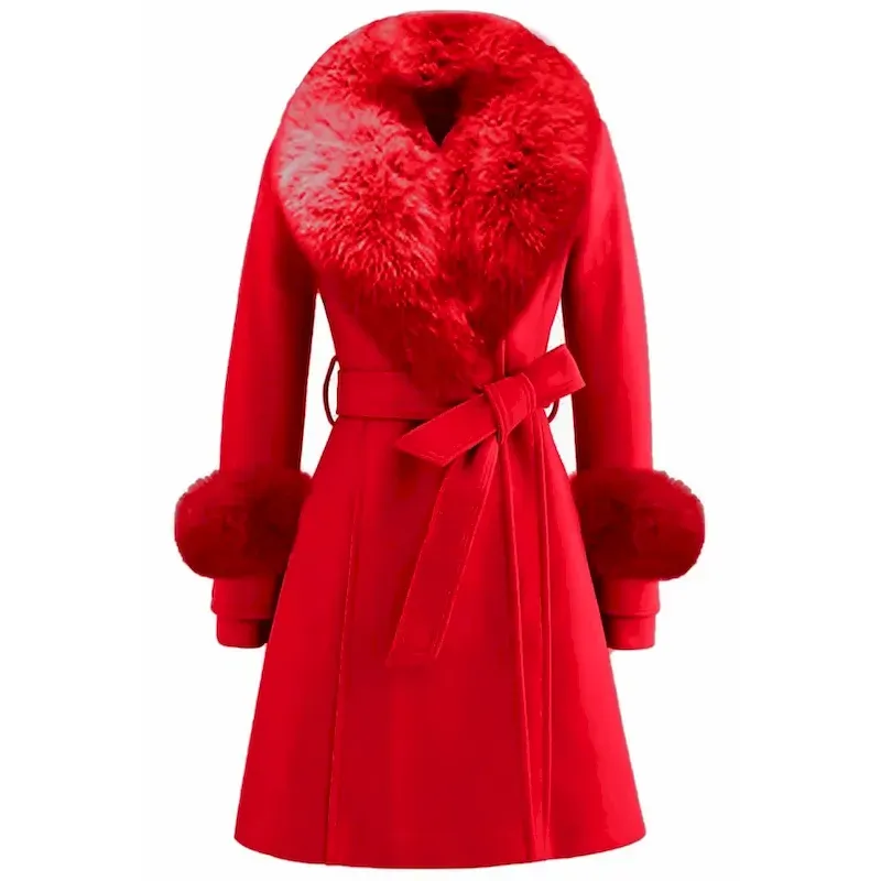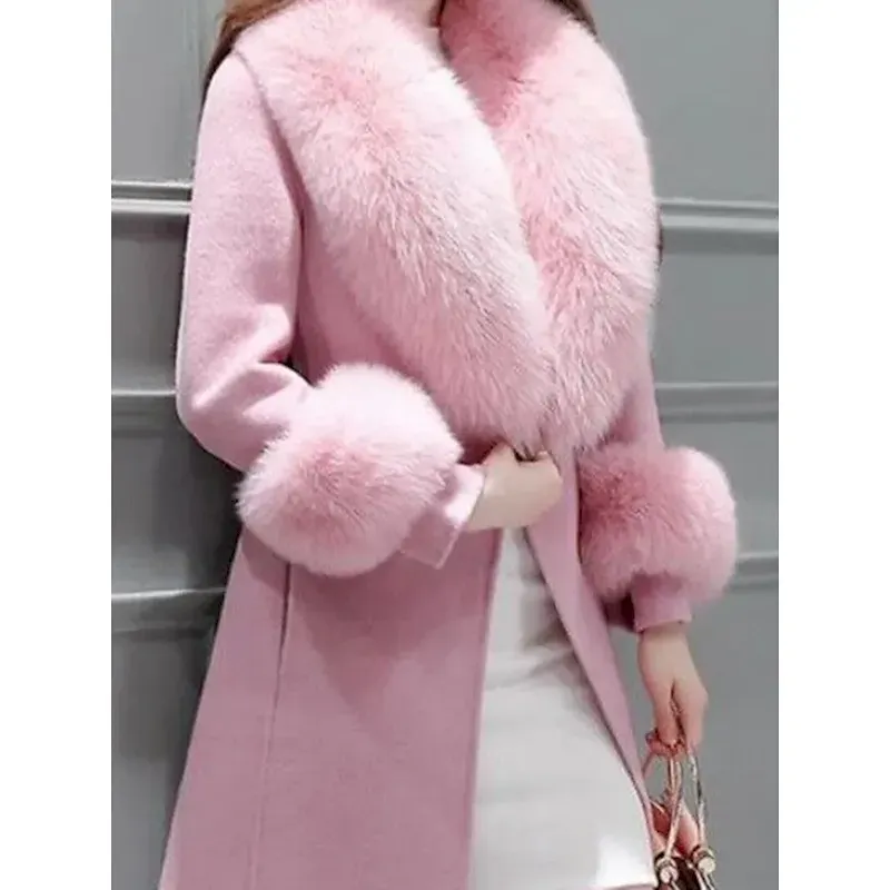 [Design Highlights]: This coat features a luxurious and fashionable design with its plush faux fur collar and matching cuffs, offering a touch of elegance and sophistication. The open front design is complemented by a waist-defining belt, adding versatility and style to your ensemble. The lapel neckline and solid color pattern contribute to its modern street style appeal.